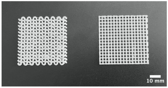 CAD is a powerful tool for the design of scaffolds with simple and complex geometries. Using CAD, we designed two types of scaffolds based on the pore shape, ellipsoidal and square, as shown in Figure 1. These CAD files were transformed into 3D-printer readable files and were printed in a conventional low-cost 3D-printer. Obtained 3d-printed scaffolds are shown in Figure 2. A piece of dimensions 40 × 40 × 1.5 mm3 were obtained. In both 3D-printed pieces, a repetitive pore shape was obtained in the whole piece, which can be used to influence the cellular aggregation and nutrient diffusion during the culture of 3D-printed scaffolds with cells [34,35], which also influence tissue formation [36,37]. In addition, the pore size of the 3D-printed scaffolds could influence cell growing, suggesting to some authors that the optimal range is between 200 and 800 µm [35,37]. In the 3D-printed scaffolds, the pore size ranged between 1000 and 1500 µm (Figure 1).