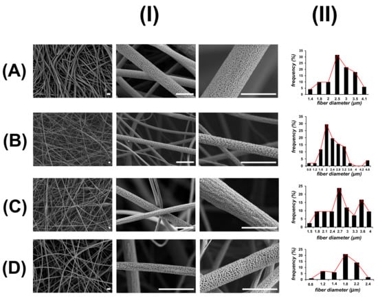 SEM images (I) and size distribution of fiber diameter (II) of PLA-based electrospun fibers: (A) PLA10, (B) PLA/PEG, (C) PLA/PEG/2.5HA, and (D) PLA/PEG/5.0HA. Scale bar is 5 µm.