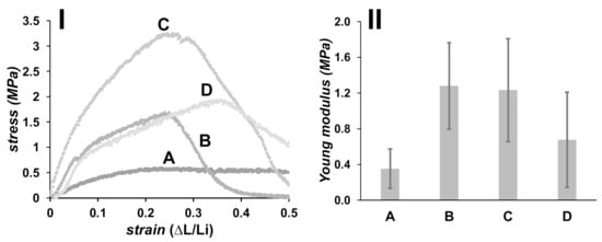 Tensile stress–strain plot (I), and Young modulus for PLA-based fibers (II): (A) PLA10, (B) PLA/PEG, (C) PLA/PEG/2.5HA, and (D) PLA/PEG/5.0HA.