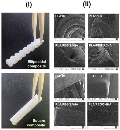 (I) Images of 3D-printed/electrospun composites obtained after combining 3D-printed PLA pieces with ellipsoidal and square pores with PLA-based fibers. (II) SEM images of the fibrous layer of PLA-based electrospun composites deposited over the surface of 3D-printed pieces.