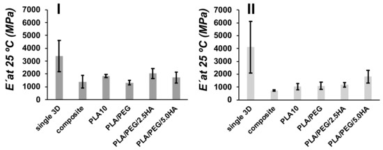Comparison of E′ for ellipsoidal (I) and square (II) pore shape 3D-printed materials at 25 °C for single 3D-printed pieces (single 3D), two 3D-printed pieces bonded (composite), and 3D-printed/electrospun composites (PLA10, PLA/PEG/, PLA/PEG/2.5HA, and PLA/PEG/5.0HA).