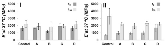 E′ at 37 °C of ellipsoidal (I) and square (II) 3D-printed/electrospun composites immersed in SBF media for 30 days. A control sample is a composite prepared without covering the surface of 3D-printed pieces with fibers, and A-D are those composites prepared with a layer of PLA-based fibers: (A) PLA10, (B) PLA/PEG, (C) PLA/PEG/2.5HA, and (D) PLA/PEG/5.0HA.