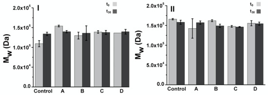 Molecular weight of 3D-printed/electrospun composites immersed in SBF at t0 and t30 was studied by GPC, estimating the molecular weight by using narrow PMMA standards. Considering that the mass of the composite is mainly the 3D-printed structure, the results shown in Figure 10 are related to the molecular weight of the PLA used in the fabrication of 3D-printed structures. 3D-printed/electrospun composites at t0 present a Mw of 1.0–1.6 × 105 Da, with PDI ranging from 1.69 to 1.75. No significant differences in Mw are observed at t30; thus, no evidence of PLA degradation after 30 days was observed.