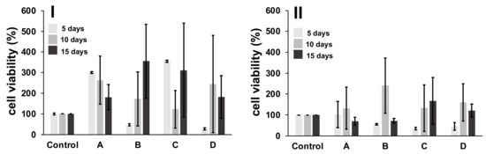 MTT assay for cells after contact with 3D-printed/electrospun ellipsoidal (I) and square (II) composites. A control sample is a composite prepared without cover over the surface of 3D-printed pieces with fibers; and A-D are those prepared with PLA-based fibers: (A) PLA10, (B) PLA/PEG, (C) PLA/PEG/2.5HA, and (D) PLA/PEG/5.0HA.