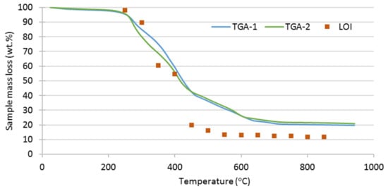 The TGA graphical results (Figure 2) indicate three different stages in the thermal decomposition of SRF, with different mass loss rates: the first in the interval around 250–450 °C, with the highest mass loss rate; the second, up to around 600 °C; and the third between 600 °C and 725 °C. From that temperature to the end of the measurements, a very slow mass loss is still observed, most likely while the chars formed are burning. These results are consistent with findings reported in the literature [4,6,7,20]. The results of LOI measurements at various ignition temperatures in the muffle (depicted also in Figure 2) shows a trend coincident with the TGA results, with major mass losses between 250 °C and 450 °C, extending to around 600 °C. The degradation ends at around 700 °C. This behaviour is different from that observed in SRF obtained in mechanical–biological treatment plants, where degradation increases up to more than 1300 °C [21].