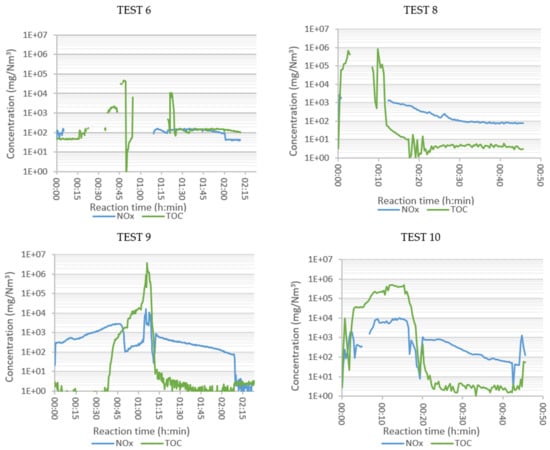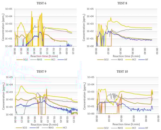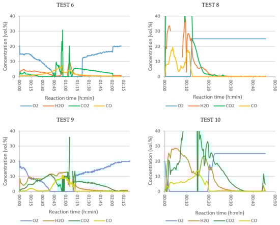 In Tests 6, 8, 9, and 10 the composition of the flue gas was analysed online, with the aim of examining the effect of the oxidizer employed and the temperature set in the tubular reactor on the SRF combustion process. The composition of the evolved gases analysed in each test, plotted as a function of time, are grouped in Figure 3, Figure 4 and Figure 5, arranged by families of compounds: