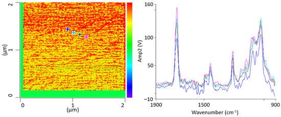 In this work, the individual scans are put into ratio and the height images of the individual measurements are subtracted. In addition, individual spectra were recorded locally. The images generated were subsequently analyzed using Analysis Studio software (Anasys Instruments, Santa Barbara, CA, USA) [27].