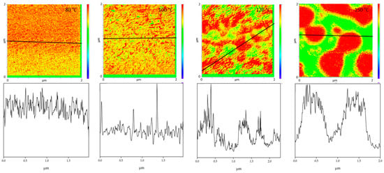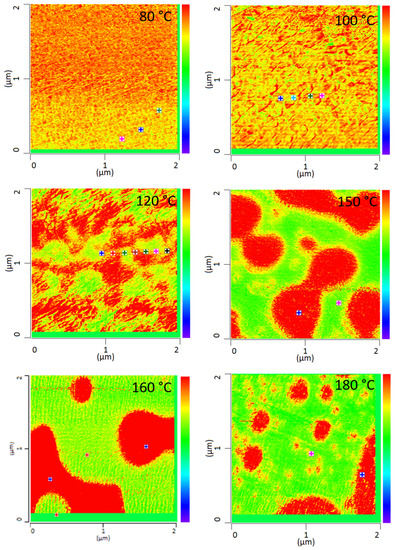 All PMMA/SAN blend samples annealed at different temperatures were characterized by IR-AFM and are shown in Figure 4. Scans were made at 1730 cm−1 and 1600 cm−1 and the ratio images were calculated respectively.
