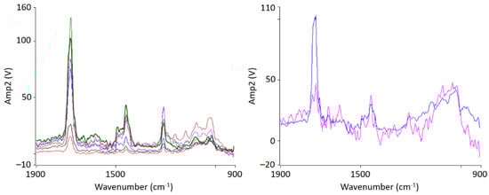 Localized nanoscale AFM-IR spectra of PMMA/SAN 50/50 blend samples at 120 °C (left) and 150 °C (right) from the indicated position shown in Figure 4. The colors of the spectra lines correspond to the color of the markings.
