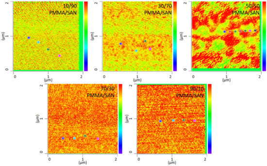 IR-AFM ratio mapping image of 1730 cm−1 and 1600 cm−1 of PMMA/SAN blend samples at different ratios annealed at 120 °C, The positions indicated (+) show where the spectra were taken.