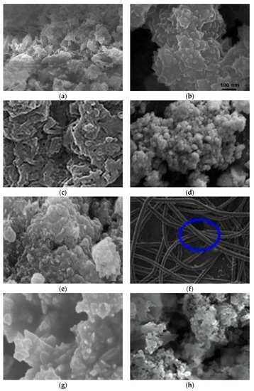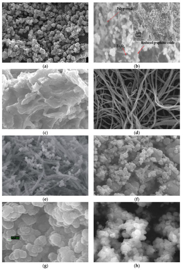 Some representative SEM images of Ppy and Ppy-based composite materials. (a) Magnetic Fe3O4@Arg-Ppy nanocomposite. Reprinted with permission from Ref. [148]. Copyright 2018 Elsevier. (b) Ppy-Fe3O4/rGO composite. Reprinted with permission from Ref. [149]. Copyright 2014 Elsevier. (c) Ppy-Nutshell of Argan composite. Reprinted with permission from Ref. [129]. Copyright 2016 Elsevier. (d) Ppy-Bacterial Cellulose Fiber composite. Reprinted with permission from Ref. [150]. Copyright 2021 Springer Nature. (e) Ppy-mixed oxide nanocomposite. Reproduced from Ref. [151]. Copyright 2018 Royal Society of Chemistry. (f) Ppy-TiO2 nanocomposite. Reprinted with permission from Ref. [152]. Copyright 2012 Elsevier. (g) Ppy-Magnetic Corncomb Biochar composite. Reprinted with permission from Ref. [153]. Copyright 2018 Elsevier. (h) Fe3O4-TiO2-Ppy nanocomposite. Reprinted with permission from Ref. [154]. Copyright 2016 Springer Nature.