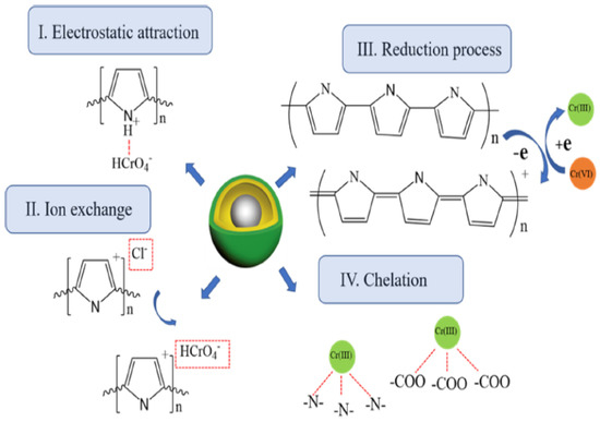 In another paper, removal of Cr (VI) from aqueous solution was reported [103], using polypyrrole/monodisperse latex spheres and also by using polypyrrole/calcium rectorite composite [104]. Further, the removal of Cr (VI) and Cu (II) metal ions from aqueous media was reported by [105], using polypyrrole–maghemite magnetic nanocomposites. The removal of another heavy metal Hg (II) ions by polypyrrole-functionalized CoFe2O4@SiO2 was reported by [106]. Adsorption of heavy metal Pb (II) ions in polypyrrole–bentonite nanocomposites [107] and in polypyrrole–Fe3O4 nanosized magnetic adsorbents were also reported [108]. The removal of cadmium Cd (II) ions from wastewater was reported by [109], using polypyrrole–TiO2 nanocomposites. A detailed review on the utilization bio-composites coated by polypyrrole was reported by [110], while another study pointed to microbial fuel cells, coupled with Fenton oxidation [111], for the removal of heavy metal ions from wastewater. Polypyrrole-coated sawdust of dryobalanops aromatic for the adsorption of cadmium-109 isotopes was reported by [112]. The removal of arsenic from wastewater was reported by [113], using polypyrrole composites with bentonite and activated carbon. Some of the proposed adsorption mechanisms for Cr (VI) removal by polypyrrole-modified magnetic nanocomposites are demonstrated in Figure 6. In addition, some HMIs removal by polypyrrole-modified adsorbents are listed in Table 4.