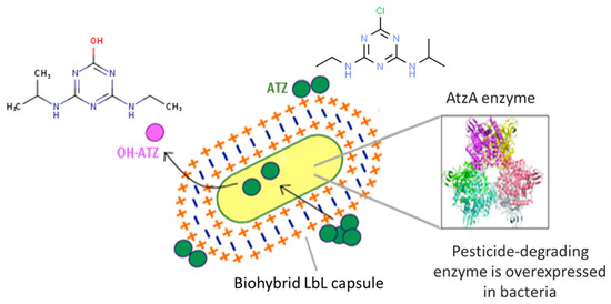 Illustration of the biohybrid LbL capsule based on alternating, oppositely charged polyelectrolytes, coating bacteria overexpressing the enzyme AtzA.