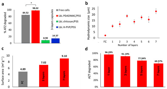 All capsules composed out of the different polycations along with PSS exhibited a high positive ζ-potential, associated with the formation of stable complexes, which repel each other in colloidal dispersions and have a minor tendency to aggregate [34]. The ability of the LbL coated bacteria to transform ATZ into OH-ATZ improved significantly (p < 0.05) compared to free cells (FC) only when the bacteria were coated with polyDADMAC/PSS (Figure 3a). The other capsules, based on chitosan or HPVP-co-S, seemed to hinder ATZ biodegradation. It should be noted that FC controls were subjected to the same treatment steps as encapsulated cells, including centrifugation cycles, rinsing steps and resuspensions in PBS, however the results were not significantly different than fresh free cells not subjected to the same treatment regime.
