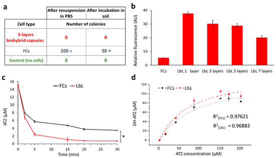 To further examine their potential as improved remediating agents, we focused on the ability of the coated cells to biodegrade ATZ without undesired proliferation. The AtzA enzyme is Fe(II)-dependent, operating without any other internal or external co-factors, thus the E. coli cells can be rendered non-viable yet remain active [46,47]. This is an important aspect in bioaugmentation; first, it can prevent the ecological stress associated with introducing non-indigenous populations into the well-defined natural hierarchy of soil microorganisms [48,49]. Also, it allows for a stable and continuous application of whole-cell biocatalysts, under undesired environmental conditions (salinity, temperature, availability of nutrients, etc.) that hinder microbial growth [50]. For this, the viability of the 3-layers PolyDADMAC/PSS biohybrid capsules was estimated by a colony formation assay, with plating done on solid LB medium with chloramphenicol and, in comparison to free cells. Plating was performed either immediately after the encapsulation process (resuspension in PBS) or after one week of incubation in sterile moistened soil, as described in Figure 4a. In addition, we performed a dead/live assay using propidium iodide (Figure 4b). PI is a cell-impermeant red-fluorescent stain that only labels cells with damaged cellular membranes. All the biohybrid capsules, regardless of the number of layers, showed high PI fluorescence intensity compared to the free cells, reinforcing the premise that polyDADMAC compromises the bacterial cell envelope facilitating diffusion of small organic molecules. In addition, combined with the colony formation assays, the dead/live viability assay further confirmed that encapsulated E. coli cells are non-vital.