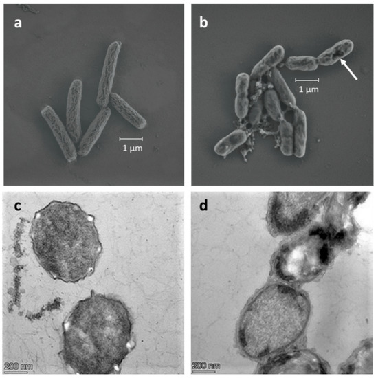 Scanning electron micrographs of the 3-layers LbL coated cells, compared to FCs, are presented in Figure 5a,b. FCs exhibited a typical rod-like shape, whereas coated cells were less elongated and more rounded. The bio-hybrid capsules also showed some irregular fragments and loss of membrane integrity, similar to SEM images taken by Ansari et al., corroborating the speculated damage caused to the bacterial envelope by polyDADMAC [52]. Cross-sectional TEM images of the LBL bio-hybrid capsules revealed the presence of a thin, floccose layer, which is heterogeneous in shape and clearly different than the darken bacterial envelope of FCs (Figure 4c,d).
