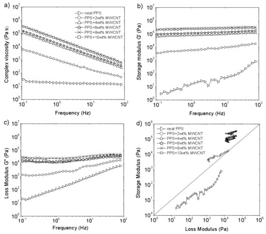 Rheological properties of PPS/MWCNT composites: (a) complex viscosity as a function of frequency; (b) storage modulus as a function of frequency; (c) loss modulus as a function of frequency, (d) Cole-Cole plot. The test was performed at 320 °C with 10% strain.