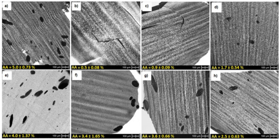 Optical micrographs illustrating the state of MWCNTs’ agglomerate dispersion at different temperature and MWCNT content: (a) PPS + 10 wt% MWCNT masterbatch, (b) PPS + 10 wt% MWCNT (T = 290 ℃), (c) PPS + 10 wt% MWCNT (T = 305 ℃), (d) PPS + 10 wt% MWCNT (T = 320 ℃), (e) PPS + 2 wt% MWCNT (T = 320 ℃), (f) PPS + 4 wt% MWCNT (T = 320 ℃), (g) PPS + 6 wt% MWCNT (T = 320 ℃), (h) PPS + 8 wt% MWCNT (T = 320 ℃).