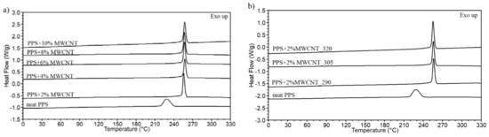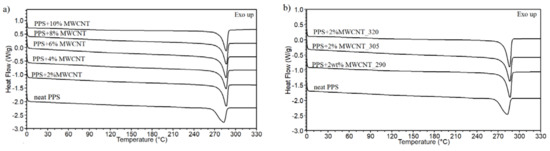 There is no effect of the MWCNT content and extrusion temperature on the melting point. Moreover, the melting peak of neat PPS is broad, and it is getting narrower for PPS/MWCNT composites, which reveals the changes in the crystal phase of the polymer, as demonstrated by an increase in the crystallinity degree and crystallization temperature. As shown in Table 1, for most of the composites, the addition of MWCNTs causes an increase in the crystallinity content at a maximum of 18% and an increase in the crystallization temperature of 29 °C. The nucleation effect of MWCNTs on PPS is visible by a significant shift in the crystallization peak, as presented in Figure 4a,b.