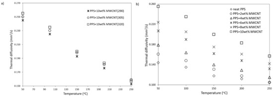 Thermal diffusivity vs. (a) temperature of PPS-based composites filled with MWCNT and (b) temperature of PPS-based composite manufactured with different temperature.