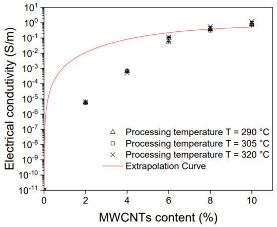 The influence of the MWCNT content and processing temperature on the level of electrical conductivity of PPS/MWCNT nanocomposites has been examined and the results are presented in Figure 6. The largest increase in electrical conductivity was observed from 10−11 S/m for neat PPS to 7·10−5 S/m for 2 wt% MWCNT, and this increase was almost six orders of magnitude. Then, the increase in conductivity slowed down and increased linearly from 2 to 6% in the MWCNT content, after which it slowed significantly, and the increase in concentration from 6 to 10% of MWCNT improved by one order of magnitude, finally reaching values of about 100.