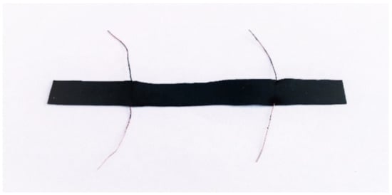 CB particles at 3, 10, 15, and 20 php (parts based on the dry weight of starch) corresponding to 1.7, 5.5, 8.1, and 10.5 wt%, respectively, were dispersed in a mixture of water and glycerol by applying sonication at ambient temperature for 1 h. The samples were marked as CB–X, where X is the CB amount in php. To obtain gelatinized starch, a suspension of starch, CB, glycerol, and water was heated at 80 °C for 10 min under continuous mechanical mixing. The weight ratio of starch/glycerol/water was 1.0:0.7:2.3. The obtained samples were dried at 100 °C for 5 h to remove excess water followed by holding at 60 °C overnight to prevent moisture absorption by the material. TPS–CB composites were then processed by kneading in a laboratory mixer Plastograph Brabender PLE 331 (Brabender GmbH, Viersen, Germany) for 10 min at 130 °C and 100 rpm. A 1-mm-thick slab was prepared by compression molding (laboratory press LabEcon 300, Fontijne Presses, Delft, The Netherlands) at 130 °C using 4 min of preheating without pressure and an additional 4 min at a pressure of 2.65 MPa. To easily remove the samples, two Teflon sheets were inserted between metal plaques and molds. To prepare the slabs for online measurements of the electrical current during deformation, two copper wires were inserted into the material during compression. Samples (0.7 mm thick) with dimensions of 100 × 10 mm were compression molded using a custom mold. Figure 1 shows the representative specimen used for online measurements.