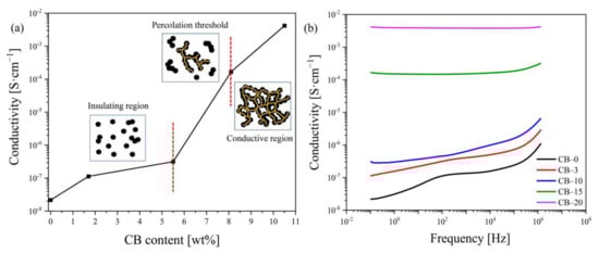 Figure 2b shows the frequency–dependent conductivities of TPS–CB composites for different filler contents. The electrical conductivity of TPS–CB composites increases with increasing CB content. Three different modes of dependence are observed for the TPS–CB composites (Figure 2b). For CB contents below the percolation threshold (i.e., 3 and 10 php), the composite exhibits typical behavior for an insulating polymer, where the conductivity increases almost linearly (in our case from ~10−7 to 10−5 S·cm−1) as the frequency increases from 1 Hz to 1 MHz. When the CB content lay approximately in the percolation threshold (CB–15), the second group showed constant electrical conductivity at low frequencies of 1–105 Hz, whereas the conductivity increased at frequencies higher than 105 Hz. Both isolated CB particles and conduction pathways exist in this composite. The conductivity increased with the frequency due to the growing importance of polarization effects [35]. The third mode of the course appears for the CB content above the percolation threshold (CB–20), where the absolute value of the conductivity remains constant with rising frequency, indicating the presence of stable conducting CB paths in the composite.