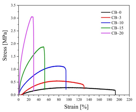 Figure 3 shows representative stress–strain curves for neat TPS and TPS–CB composites. A small linear elastic region followed by a nonlinear zone until the fracture point can be observed for all samples. Stress increases continuously with rising strain until fracture, which is typically referred to as plastic deformation. This behavior is similar to that indicated in the literature for starch–based films [36,37]. The addition of higher amounts of CB results in a progressive enhancement in maximum tensile strength along with a substantial decrease in elongation at break, indicating filler–matrix interactions.