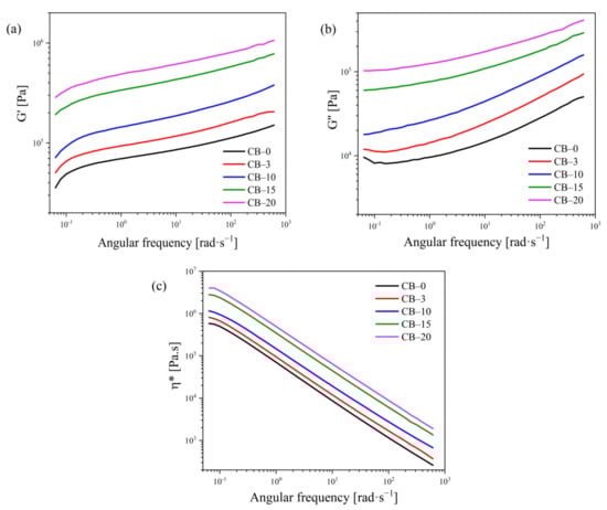 The rheological properties of TPS–CB samples (circles with a diameter of 20 mm) were investigated using an AR 2000 rheometer (TA Instruments, Hüllhorst, Germany) equipped with a parallel plate geometry of 20 mm. The oscillatory mode measurements were conducted within the frequency range of 0.1–100 Hz. Before each measurement, the deformation amplitude was set up in the linear viscoelastic region determined by strain sweeps at a constant frequency.