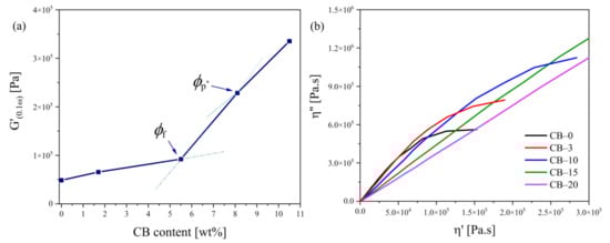 Figure 6b shows the Cole–Cole plots for neat TPS (η″ vs. η′) and its composites with various CB loadings. The presence of different concentrations of filler remarkably affects the rheological properties of TPS. At a lower CB loading of up to 5.5 wt%, viscosity curves are arc–shaped similar to that for unfilled TPS but show a tendency towards linearity through a straightening of the arc, especially with increasing filler content. On the other hand, courses with completely different shapes are observed for composites filled with higher CB amounts, reaching linear variation. The linear variation of the Cole–Cole plots is frequently associated with the densification of a 3D network. Many reports [44,48,49,50] show an increase in the slopes of linear Cole–Cole plots, which are usually due to either invasive treatments such as irradiation leading to (chemical) crosslinking within the polymer or the addition of an interaction–capable compatibilizer/filler increasing polymer–filler interactions. Thus, the change in the Cole–Cole plot indicates that a critical filler concentration above the stable 3D reinforcing physical network of filler particles is formed [49].