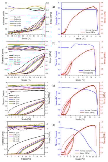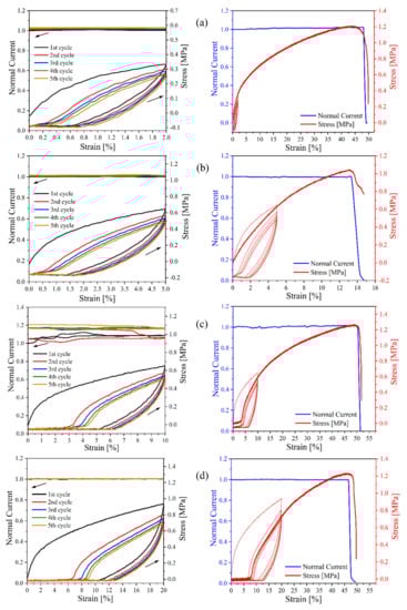 Dependence of normalized current and stress on deformation during five runs of cyclic deformation (left–hand side) and up–to–break deformation (right–hand side) for CB–20, containing 20 php CB, after various cyclic strains of (a) 2%, (b) 5%, (c) 10%, and (d) 20%.
