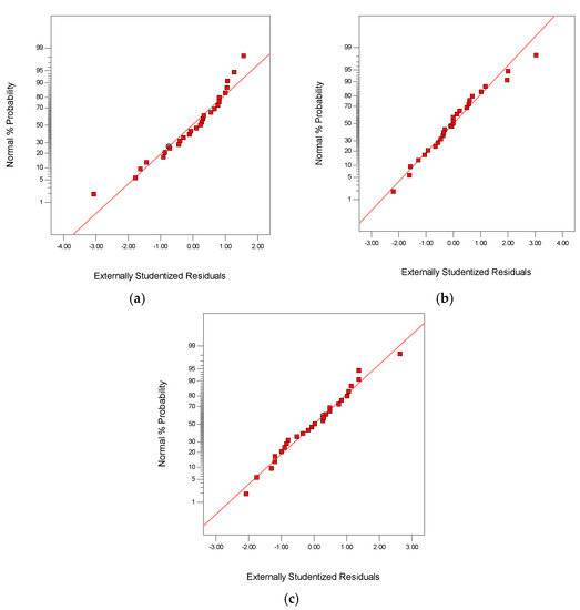 Here “Adeq Precision” of 6.867 is adequate, so the model can be applied to navigate the design space. The mathematical model in terms of actual factors is shown in Equation (7).