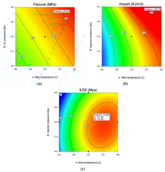 Effect of injection pressure and melt temperature on the target responses: (a) flexural strength; (b) impact strength; (c) ILSS.