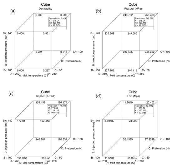 Optimization results: (a) desirability; (b) flexural strength; (c) impact strength; (d) ILSS.