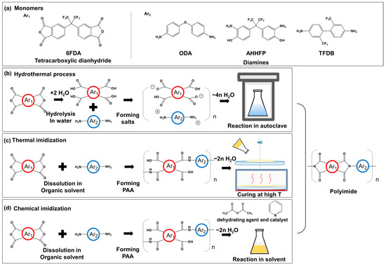 (a) monomers for fluorinated polyimides and synthetic pathways of polyimide, (b) hydrothermal process, (c) thermal imidization, (d) chemical imidization.