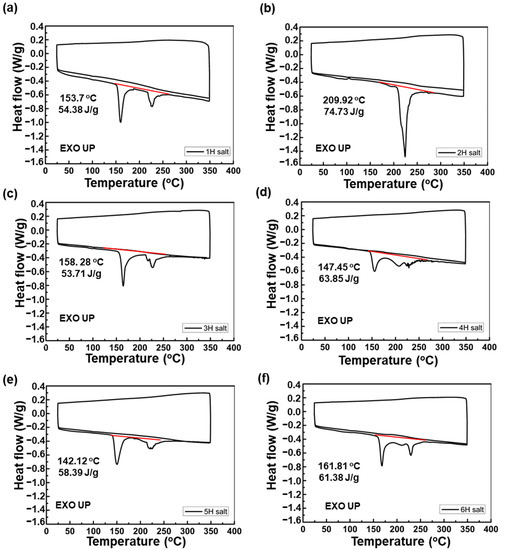 The DSC measurement of the monomer salts was carried out by three steps: heating, cooling and heating. As shown in Figure 3, all types of PIs showed an endothermic peak occurred only in the first cycle and no specific heat flow such as melting and phase transition was observed in the rest of the cycle. This confirms that only thermally irreversible polymerization occurred. On the other hand, only 2H salt had a single peak and showed the highest heat of reaction of 73.73 J/g and highest polymerization temperature. It is caused by the hydroxyl group in the AHHFP monomer structure indirectly affecting during the imidization process of monomer salts. Basically, imidization of monomer salts was known as a one-step direct reaction, but it has been reported that H2O generated during imidization remains in the polymer chain and forms hydrogen bonds with carbonyl moieties, resulting in two-step reaction and two peaks in DSC curves [26,28]. In the case of 2H salt, since hydrogen bonding with H2O occurs not only with carbonyl, but also with hydroxyl groups in AHHFP, polymerization needs more energy and occurs at a higher temperature. In the case of 1, 3 and 5H salt without AHHFP monomer, polymerization peak and residual H2O removal peak appeared independently, but in 4 and 6H copolyimide salt, the two peaks were connected because the polymerization and H2O removal reaction occurred at the same time. In conclusion, 2H salt with a hydroxyl functional group required the most energy and 4, 5 and 6 copolyimides showed approximately the average heat of reaction of PI using each amine alone.
