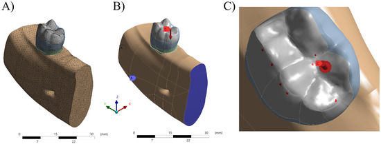 Numerical model processing. (A) Mesh generation. (B) Fixation of the system. (C) Axial load application in occlusal points.