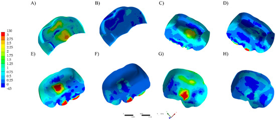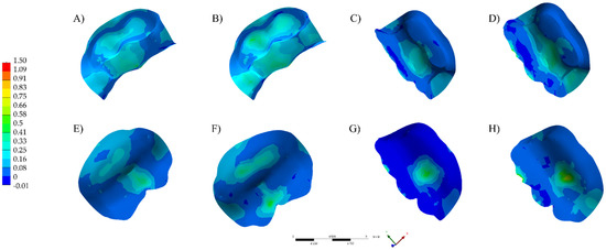 Maximum principal stress distribution in the restoration’s intaglio surface. (A) LD TFC. (B) RC TFC. (C) LD TNFC. (D) RC TNFC. (E) LD NFC. (F) RC NFC. (G) LD NNFC. (H) RC NNFC.