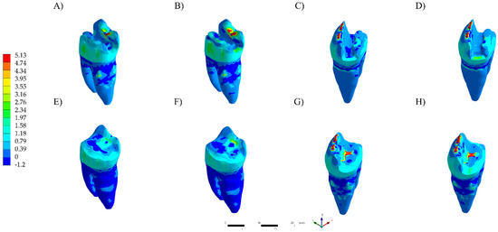 Maximum principal stress distribution in the tooth structure. (A) LD TFC. (B) RC TFC. (C) LD TNFC. (D) RC TNFC. (E) LD NFC. (F) RC NFC. (G) LD NNFC. (H) RC NNFC.