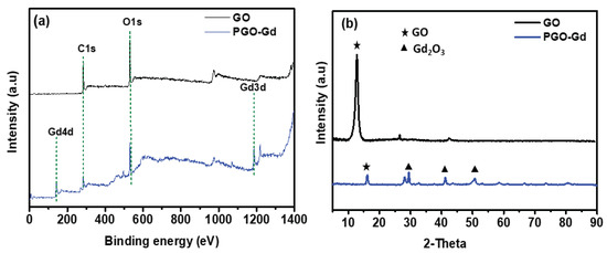 (a) XPS and (b) XRD of GO and PGO–Gd.