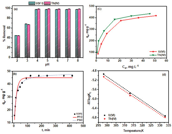 U(VI) and Th(IV) sequestration on PGO–Gd, (a) pH effect, (b) kinetic effect, (c) adsorption isotherms and (d) temperature effect.