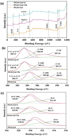 (a) Full XPS spectra of PGO–Gd. High resolution XPS of (b) carbon and (c) oxygen for U (VI) and Th(IV) adsorbed on PGO–Gd.