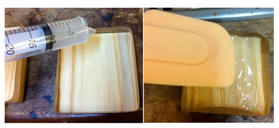 ca. 10 g) of the prepared formulations were applied uniformly onto the surface of the wood substrates with the aid of a syringe and a silicon spatula (