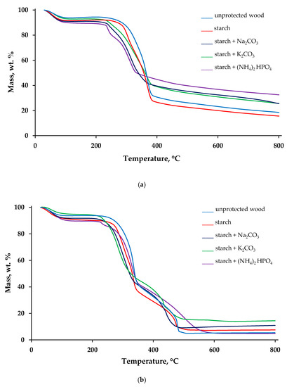 Figure 2b). However, the step in the temperature region between 300 and 400 °C was found to be consisted of two stages. The lowest temperature for the onset of thermal degradation in the air was registered for the wood sample coated with ‘starch + K