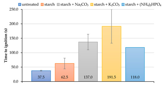 Figure 3). The application of the starch-based formulations, particularly those with salts, onto the wood surfaces significantly delayed their ignition. For example, ‘starch + K