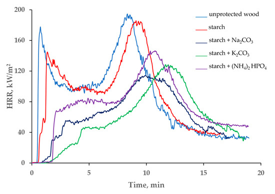 2, respectively. In addition, compared with the virgin wood, the pHRR was shifted to higher times, by approximately 2–4 min, when the coatings containing starch with sodium or potassium carbonates were applied onto the wood surface (