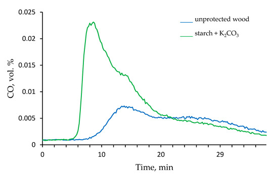 Figure 5 shows the time profiles of the CO volumetric percentage released by the untreated wood and the wood treated with ‘starch + K