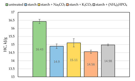 7]. This trend was also confirmed by the bomb calorimetry measurements: the average values of the heat of combustion (HC) were lower for the protected wood than for the untreated material (