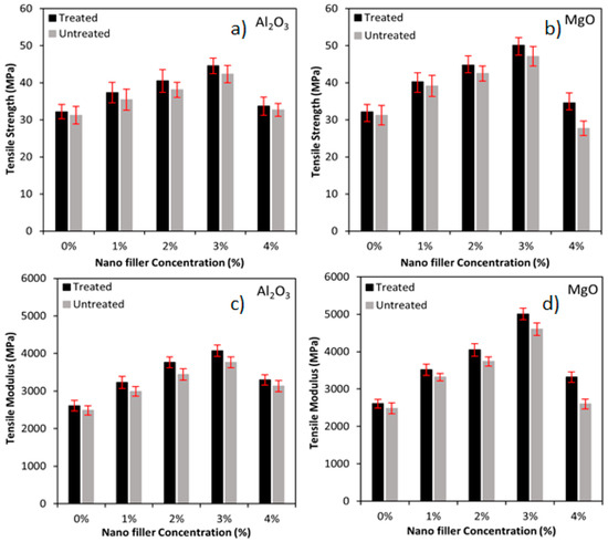 In the case of nano-MgO, the tensile strength and modulus of the treated biotex flax/PLA in the presence of nano-MgO (1–3%) increased by approximately 25%, 39% and 56% as compared to untreated, which has 25%, 36% and 51%, respectively, while the modulus of the treated reinforcement increased by 35%, 55% and 92% as compared to untreated which has 34%, 50% and 85%, respectively, when compared to the unfilled sample (0% of nano-MgO). Further increase in the nanofiller concentration to 4% reduced the tensile strength by 31% (treated) and 41% (untreated) and the modulus by 34% (treated) and 44% (untreated), respectively, when compared to the sample with 3% of nano-MgO as shown in Figure 1b,d. The tensile strength and modulus of Al2O3-filled hybrid nanocomposite are higher than those of MgO-filled nanocomposite. This could be due to the higher molecular weight and higher topological polar surface area of Al2O3 nanofillers. A similar conclusion was reported in luffa/PbO/epoxy [52], short nylon fiber/nanoclay [59], coir, wood fiber/nanoclay/PP [60], and carbon/graphene/epoxy [61].