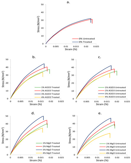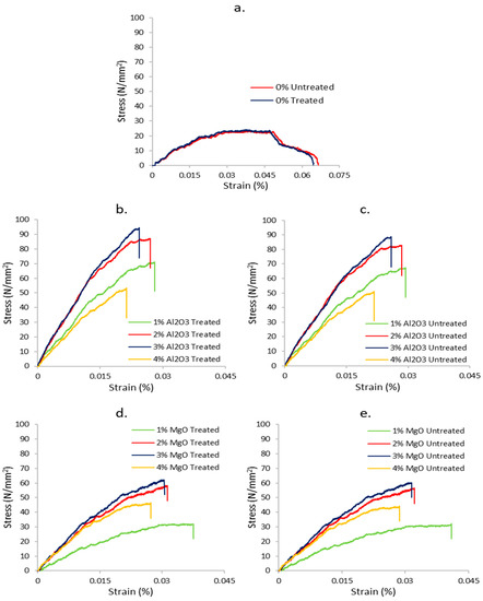 Tensile stress–strain curves of (a) neat composite, (b) Al2O3—treated, (c) Al2O3—untreated, (d) MgO—treated, and (e) MgO—untreated flax/PLA epoxy hybrid composites.